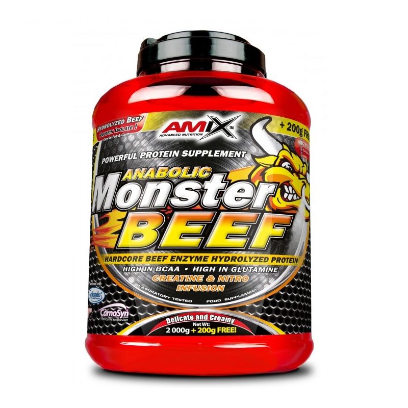 Enzimatska hidroliza skraćuje vrijeme probave proteina te se on vrlo brzo apsorbira u krvotok gdje vrši svoju primarnu funkciju koja je izgradnja mišićnog tkiva kao i ostalih tkiva u organizmu. ANABOLIC MONSTER BEEF PROTEIN dodatno je obogaćen s kreatin monohidratom te sadrži i Amix-ov Nitro Shot kompleks koji se sastoji od dvije vrste arginina, citrulina i beta alanina što pojačava krvotok i osigurava brzu apsorpciju i dostavu hranjivih tvari u mišiće. Proizvod još sadrži i Amixov PhosphoMatrix koji sadrži važne minerale koji su potrebi svim sportašima i aktivnim pojedincima.