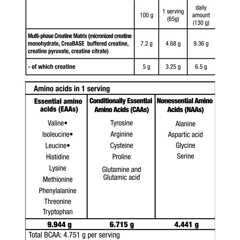 Hyper Mass 5000 sadrži 3.250 mg kreatin monohidrata u svakoj servirnoj dozi. Kreatin povećava fizičku izvedbu u uzastopnom nastupu kratkoročnog treninga visokog intenziteta. Najbolji efekt dobiva se dnevnim unosom od 3g kreatina.