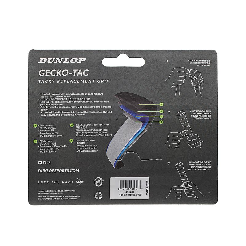 Dunlop Gecko-tac je osnovni grip nudi izvrsnu apsorpciju vlage i i poboljšanu ljepljivu površinu za ultimativnu kontrolu. Ostaje suh čak i u vrućim i vlažnim klimatskim uvjetima!
