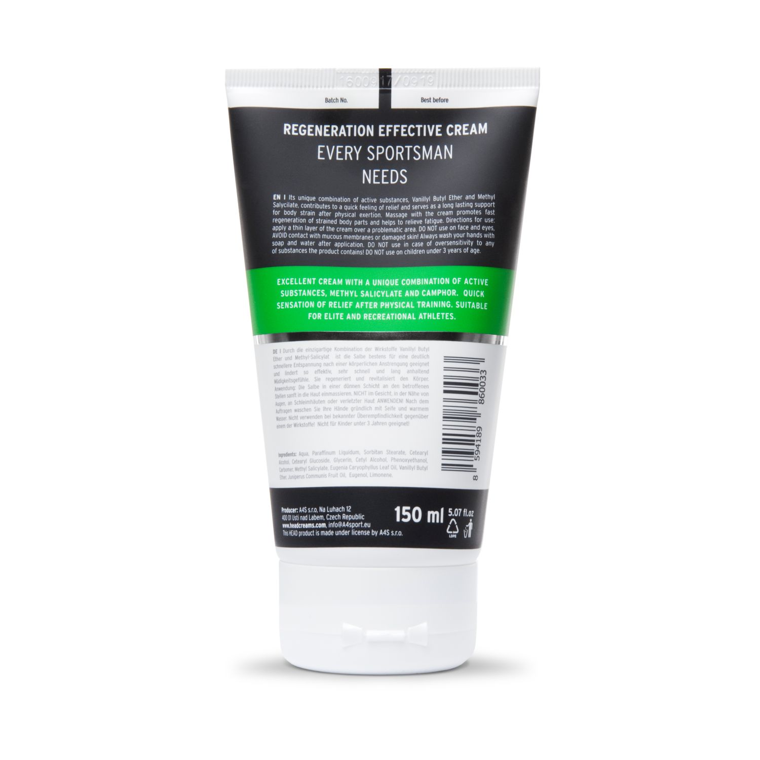 Head krema za regeneraciju - jedinstvena kombinacija aktivnih sastojaka vanilil butil etera i metil salicilata pridonosi brzom osjećaju olakšanja od napetosti nakon fizičkog napora i dugotrajnom učinku. Krema ubrzava regeneraciju napetih dijelova tijela i olakšava osjećaj umora.