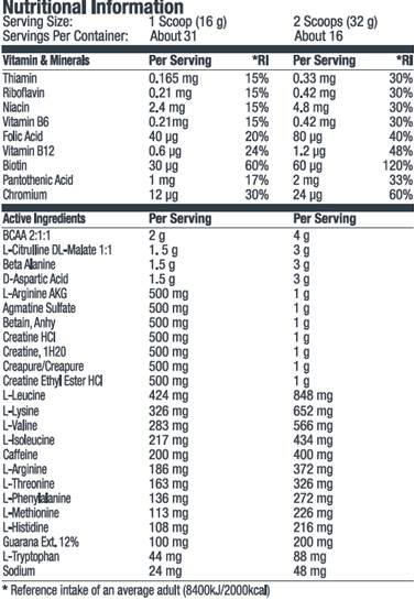 • Aminokiseline: MYPRE sadrži i 4g BCAA u 2:1:1 omjeru leucina, izoleucina i valina. MYPRE također sadrži kompletnu listu ESENCIJALNIH AMINOKISELINA uz dodatnih 800mg leucina po porciji.