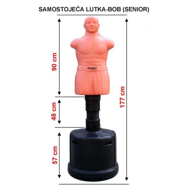 Nova Budo Sport samostojeća lutka za trening idealna je za uvježbavanje svih vrsta udaraca s tri podesive visine. Specijalno poliuretansko punjenje. Baza stalka puni se svodom (cc 100 litara vode) ili pijeskom, kako bi se nakon udarca uvijek vraćao u ravnotežni položaj.
