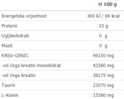 - Maximum Krea-Genic ne sadrži ugljikohidrate već samo čisti Krea-Genic, kalcij, taurin i L-Alanin