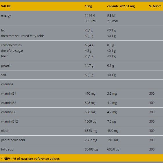 Sastav: Maltodekstrin, želatina(kapsule), nikotinamid, kalcijev-D-panotenat, piridoksin hidroklorid, bojila:titanijev dioksid, E 102, riboflavin, tiamin monohidrat, pteroilmonoglutaminska kiselina, cijanokobalamin.