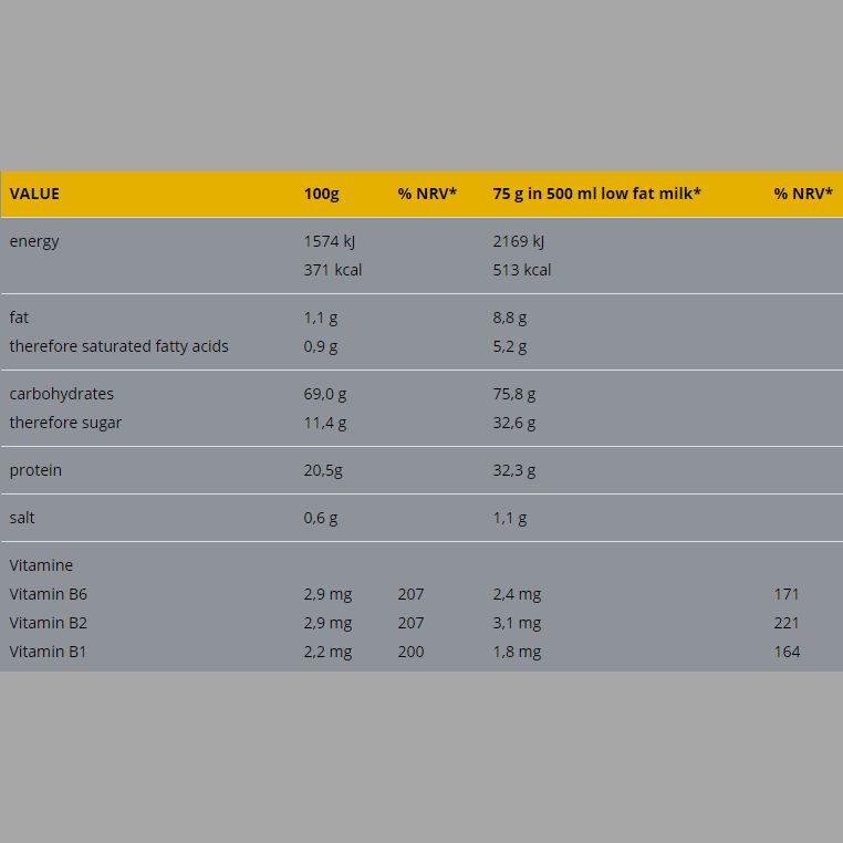 Sastav: Maltodekstrin (46,2%), koncentrat proteina sirutke (27,2%), kukurzni škrob (2,5%), koncentart miceliranog proteina mlijeka(3%), pšenični škrob (2,5%), modificirani škrob krumpira(2,5%), zgušnjivač: gura guma, ksantan guma, aroma, prah proteina jaja(1,5%), izolat proteina sirutke, (1,0%), sol, emulgatori: mono i digliceridi masnih kiselina i soja lecitin, sladilo: sukraloza, piridoksin hidroklorid, riboflavin, tiamin monohidrat, bojilo: beta-karoten