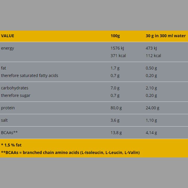 Način primjene: Promiješati 1 žličicu (30 g) praha s 250 ml vode ili malomasnim mlijekom. Uzimati 2 porcije dnevno. U dane treninga uzeti 1 porciju do 30 min nakon treninga, a drugu porciju između obroka. U danima odmora uzeti 1 porciju ujutro i 1 poslijepodne.